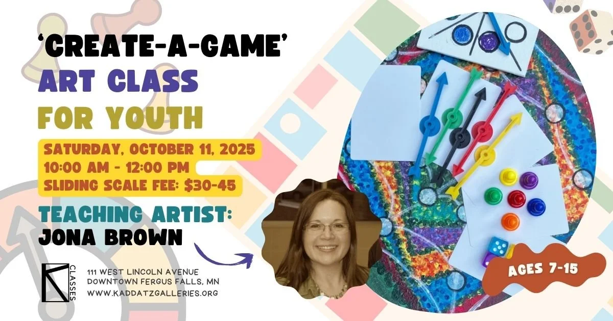 Class will take place in the Classroom located in the lower level at Kaddatz Galleries (111 W. Lincoln Ave. Fergus Falls, MN 56537).