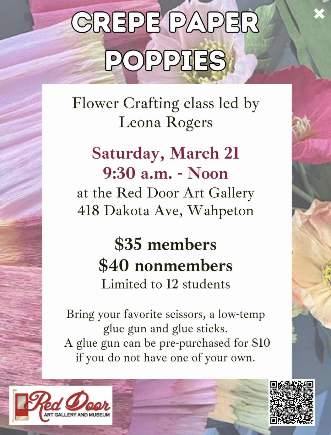 Join Leona Rogers for a hands-on flower crafting class where participants will create beautiful crepe paper poppies. This workshop is limited to 12 students, so early registration is encouraged.