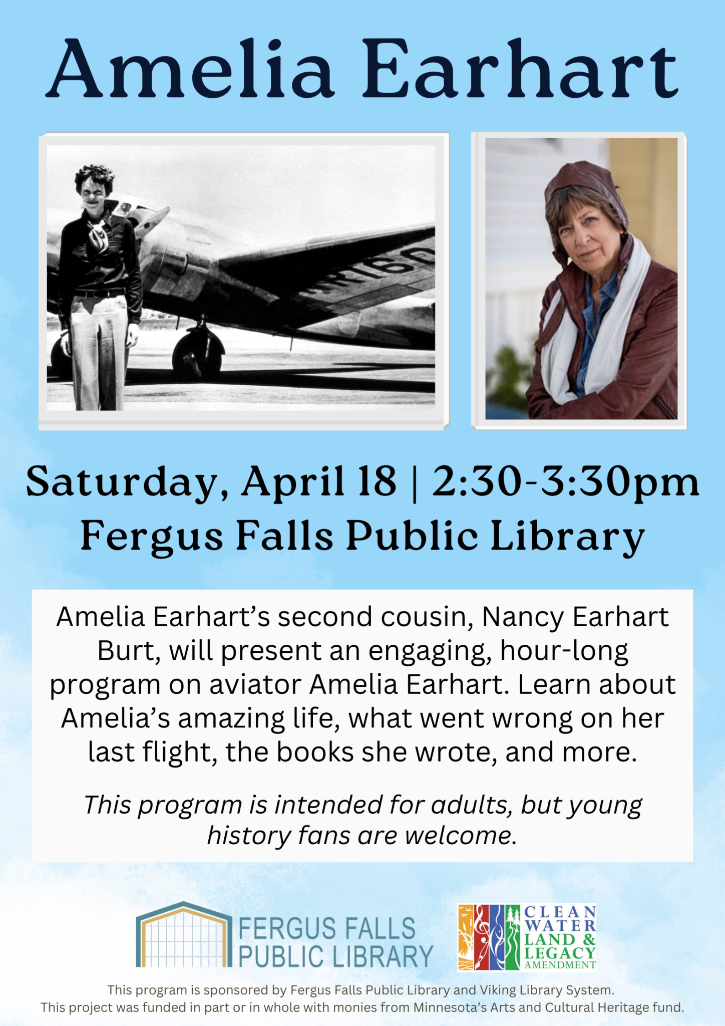 Amelia Earhart’s second cousin, Nancy Earhart Burt, will present an engaging, hour-long program on aviator Amelia Earhart. Learn about Amelia’s amazing life, what went wrong on her last flight, the books she wrote, and more.