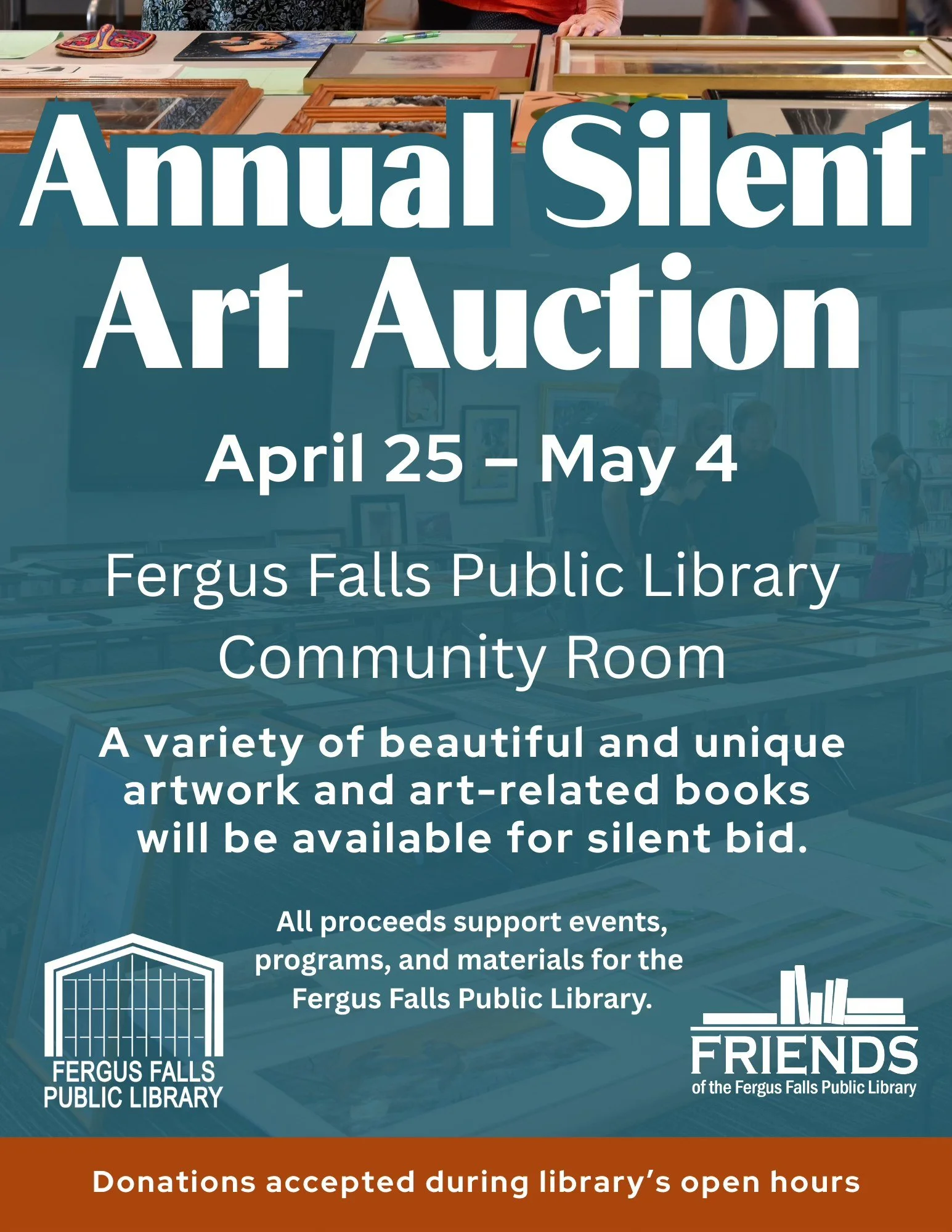 Browse a variety of beautiful and unique artwork and art-related books available for silent bid during the Fergus Falls Public Library’s Annual Silent Art Auction.