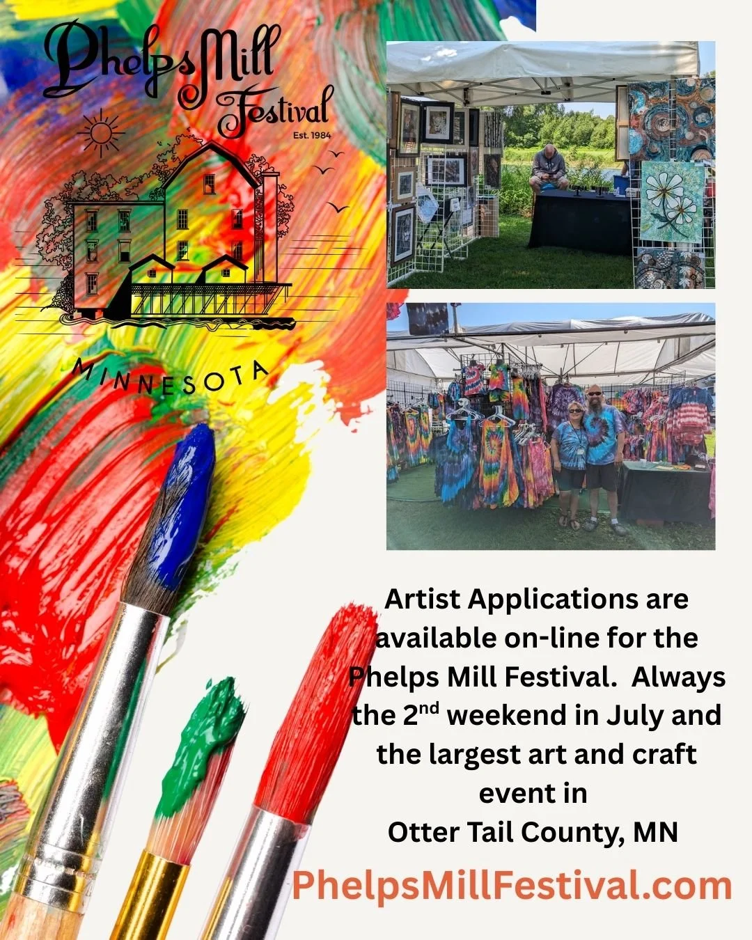 The Phelps Mill Festival is the largest art and craft event in Otter Tail County, featuring fine arts and fine crafts in a historic mill and river setting. The festival includes live entertainment, food vendors, and a Saturday Craft Beer & Wine Tasting (1:00–5:00 PM) to help draw strong afternoon attendance.